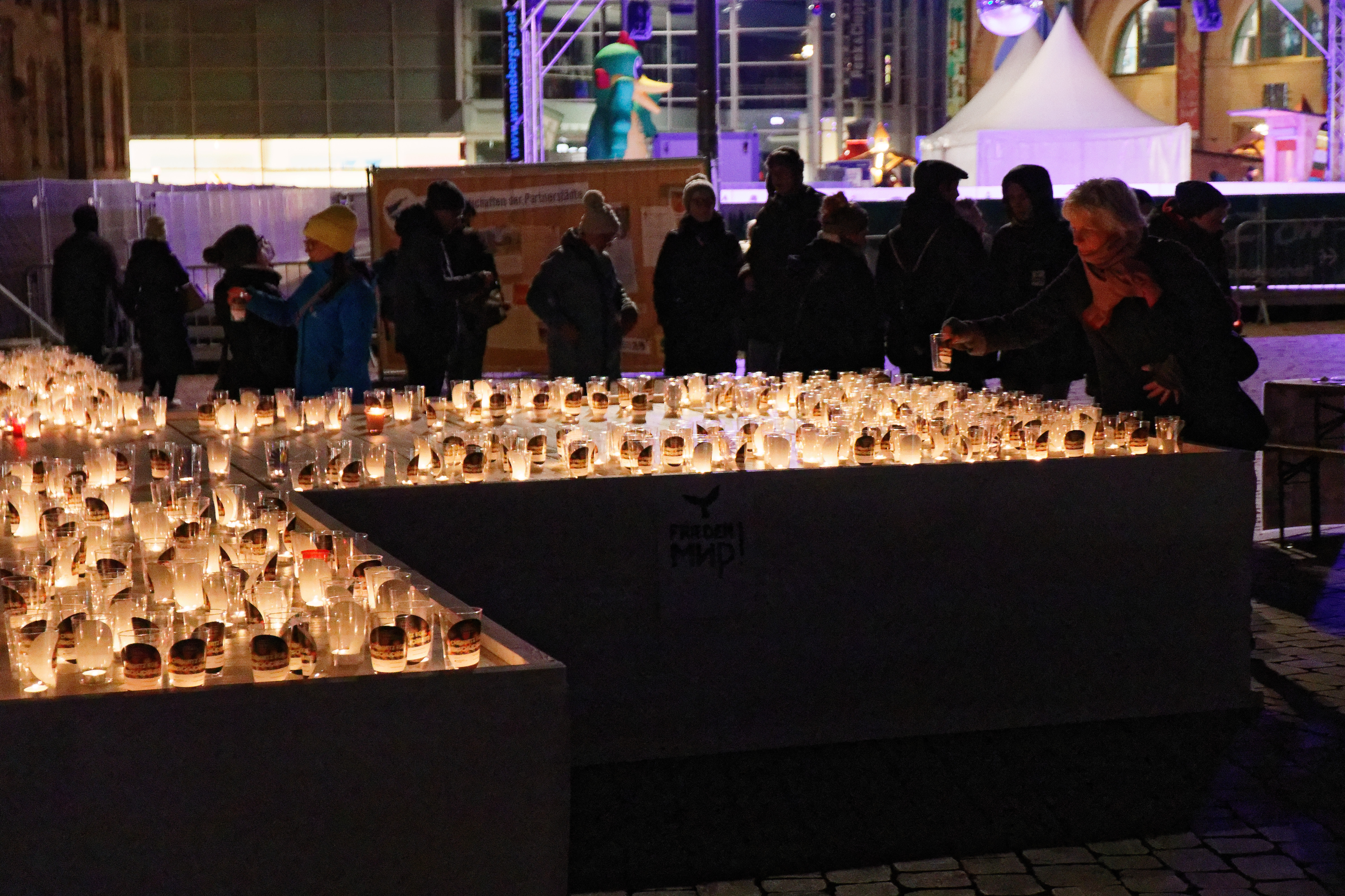 Hunderte Kerzen lassen das Friedenskreuz leuchten