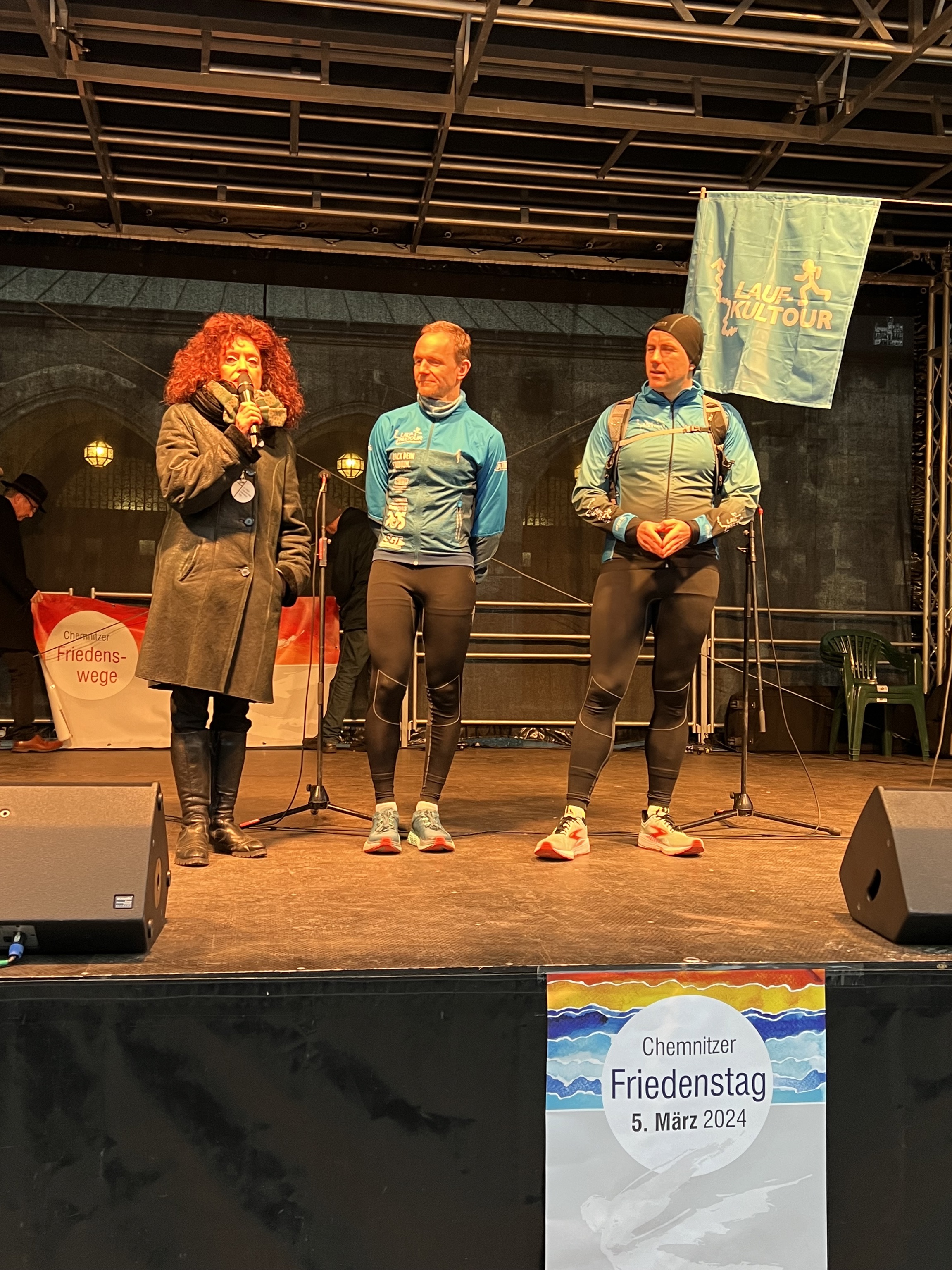 Sabine Kühnrich (Arbeitsgruppe Chemnitzer Friedenstag) verabschiedet die Sportler des Stadtsportbundes und des Vereins LaufKulTour zum Friedenslauf 2024.